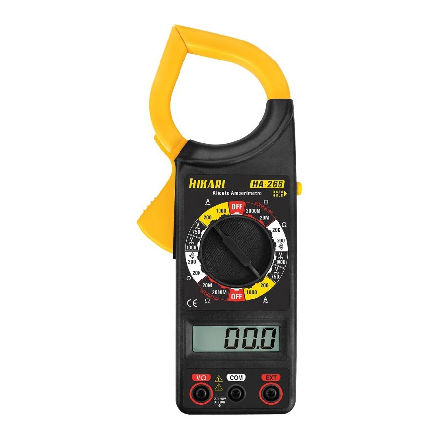 Instrumento digital portátil, de acordo com a categoria II de segurança, com função Data Hold, LCD de 3 1/2 dígitos. Realiza medidas de tensão DC e AC, corrente AC até 1000A, resistência e testes de continuidade.